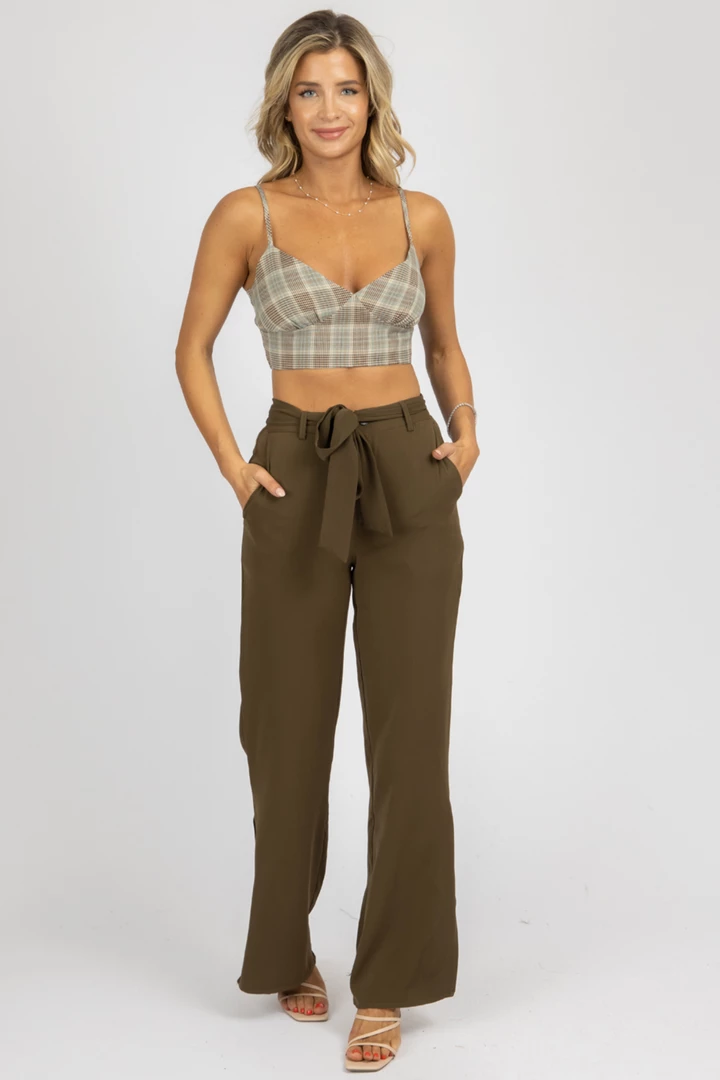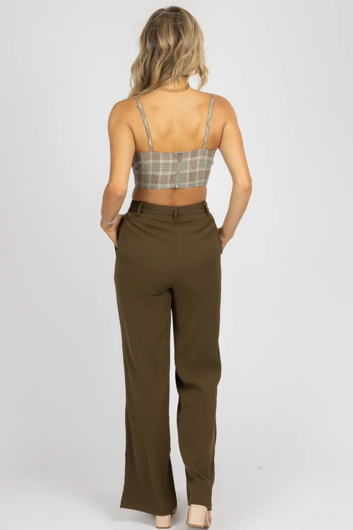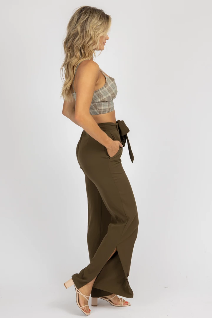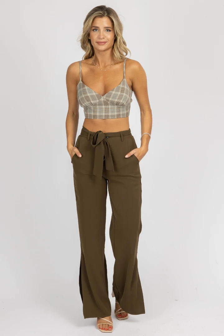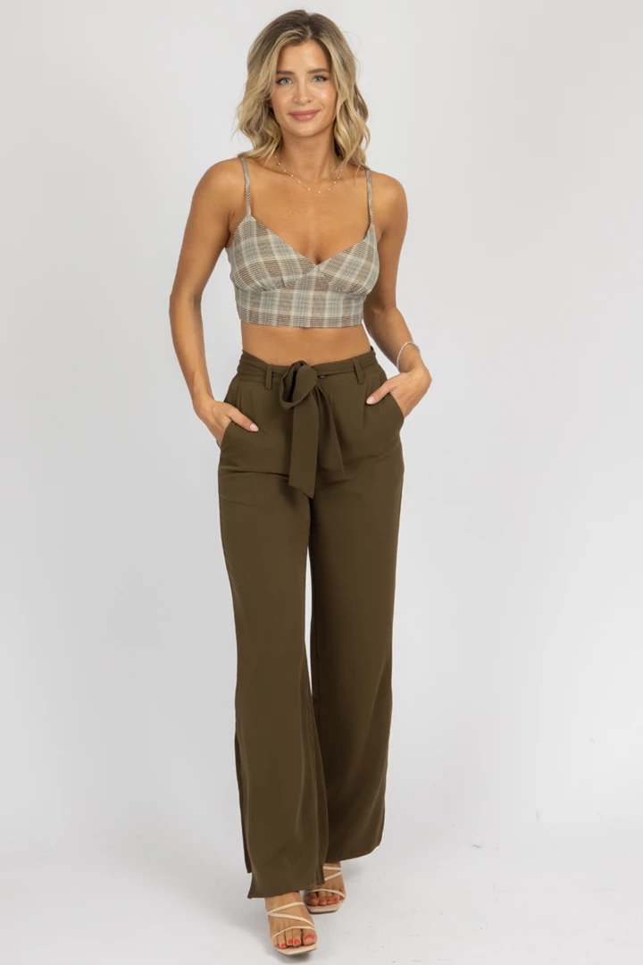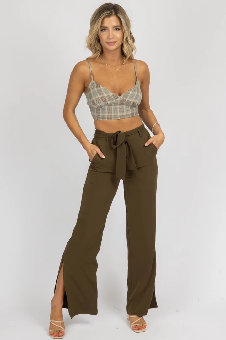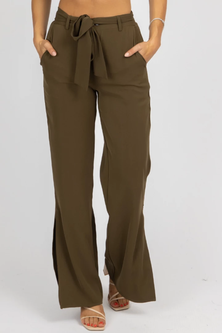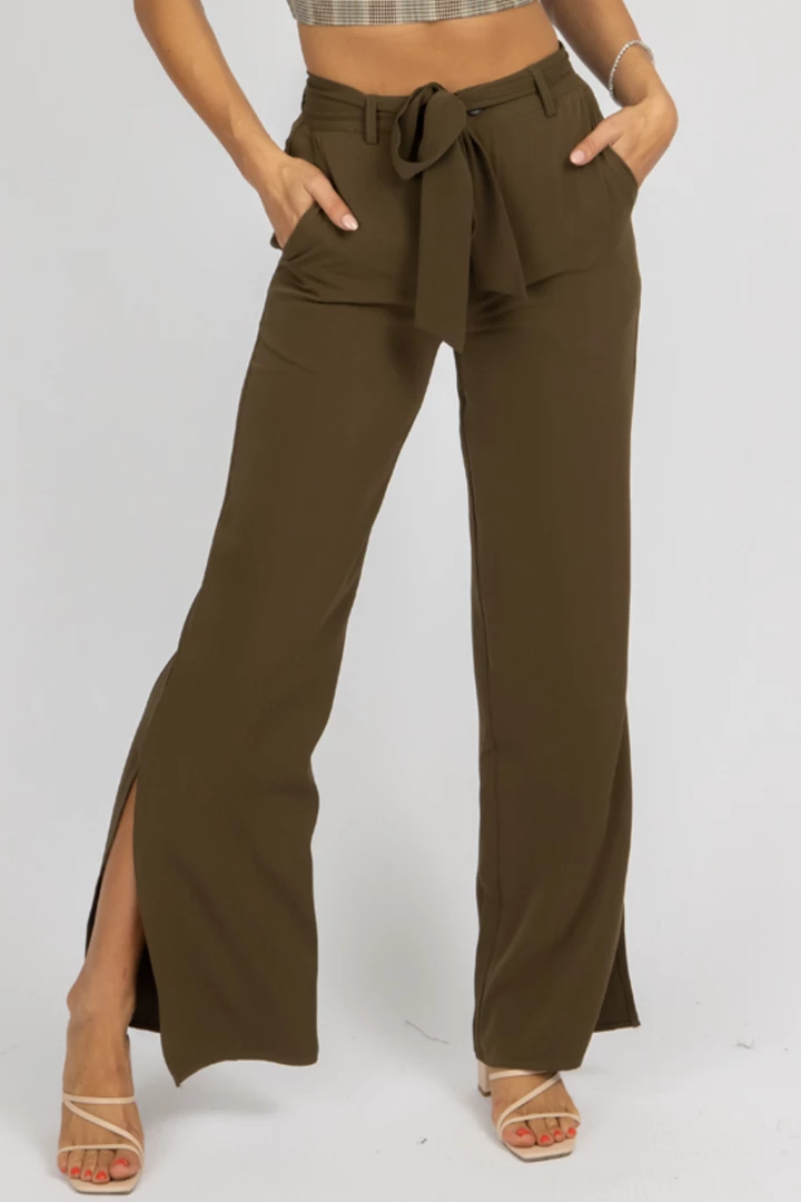 Self tie belt, Split hem, Woven, High rise, Button/zipper closure