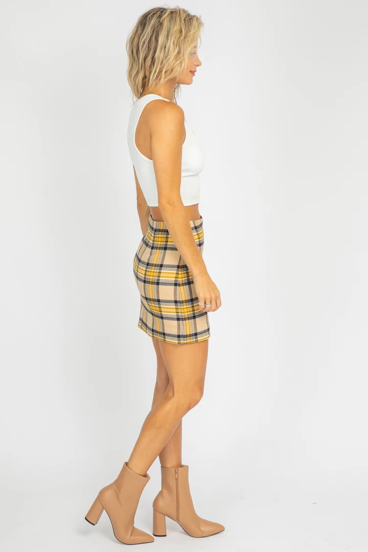 Plaid print mini skirt featuring mustard + taupe hues, High rise, Zippered