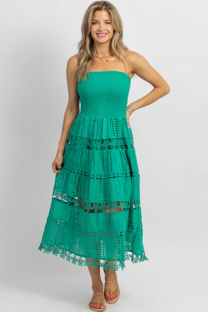 Smocked, Tube top, Eyelet detail overlay, Mini dress underneath, Midi length