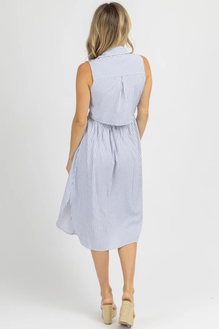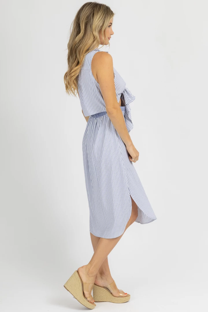 Front tie detail, Button front, Collared, Pinstripes, Sleeveless, Midi length