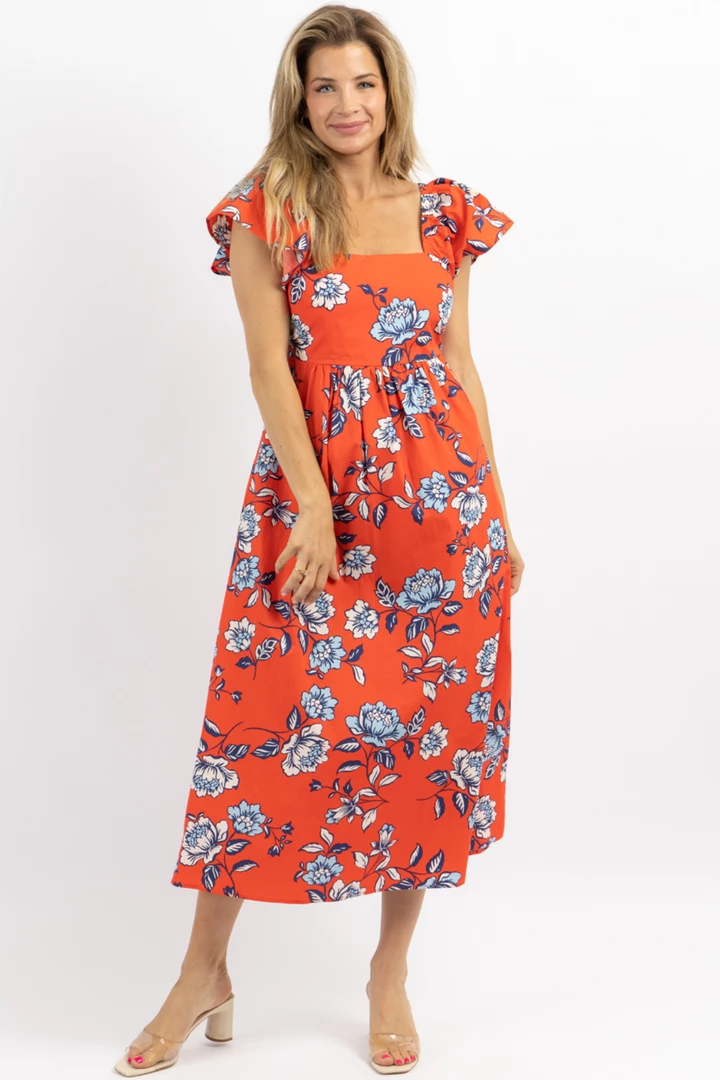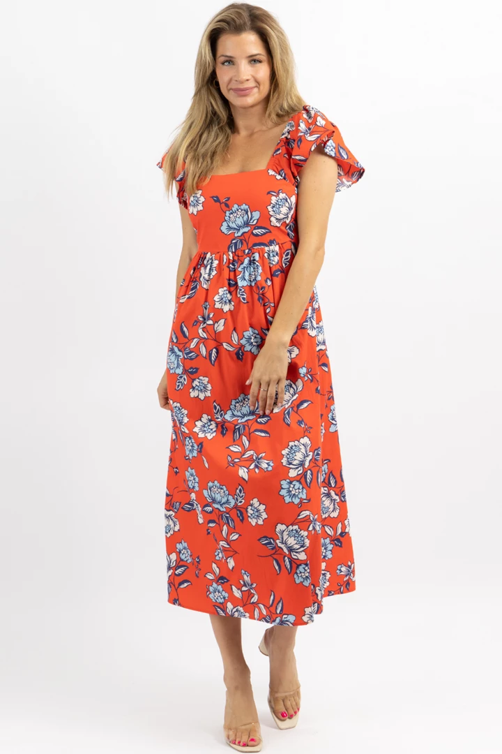 Squareneck, Short sleeves, Puff sleeves, Midi length, Floral