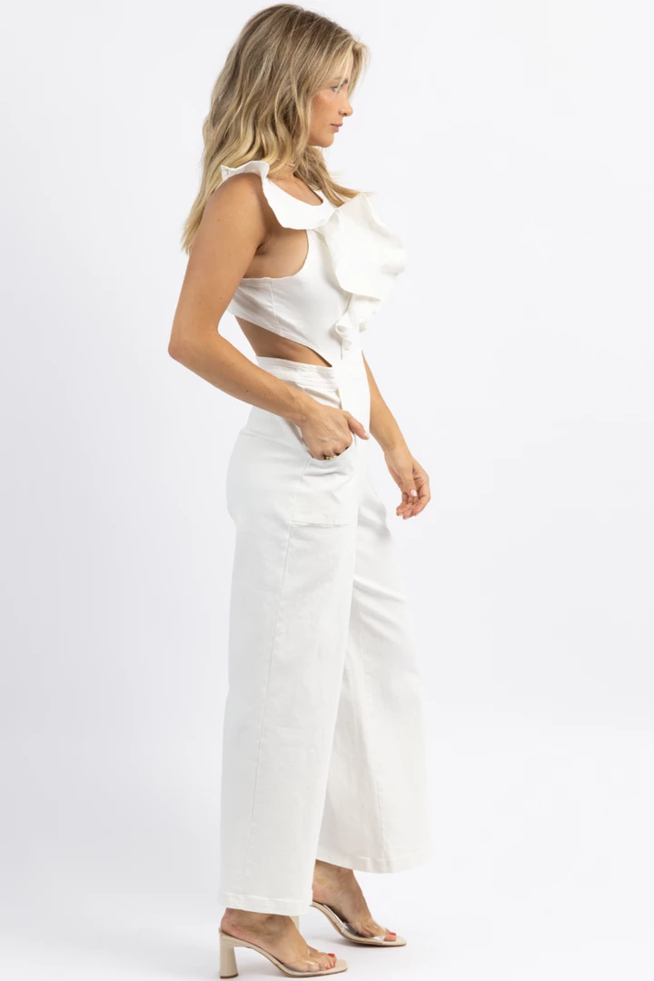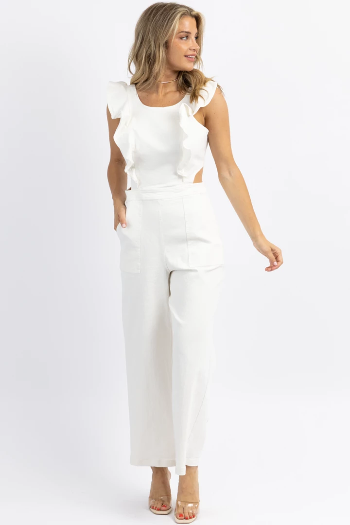 Ruffled straps, Open back, Wide leg, Denim, Sleeveless