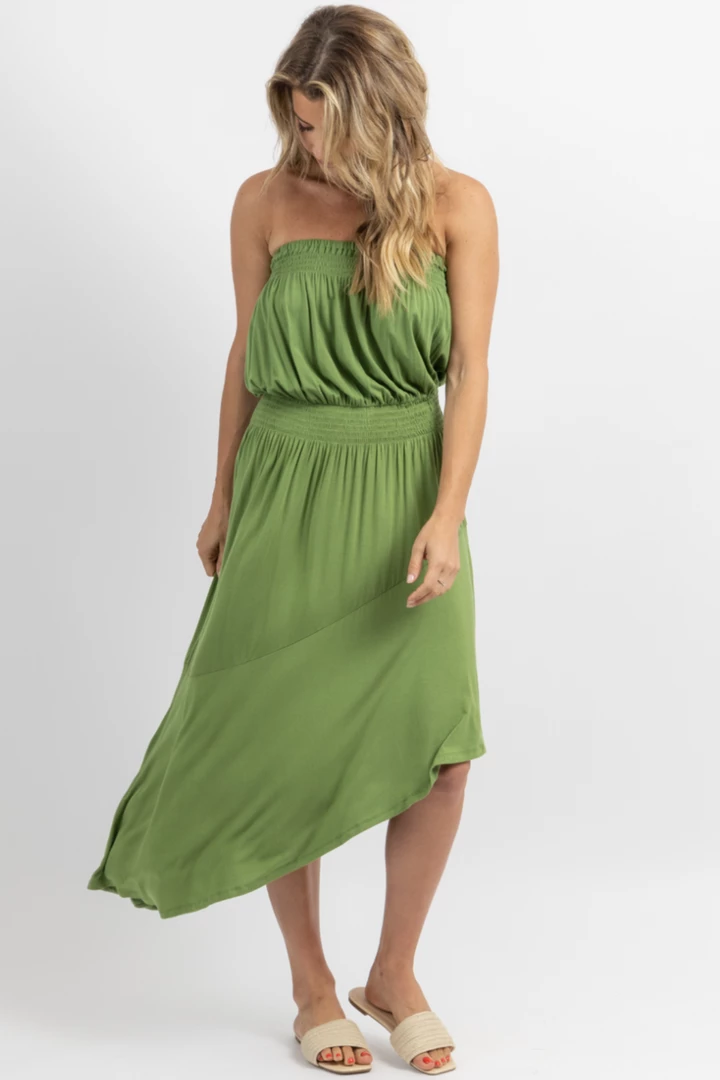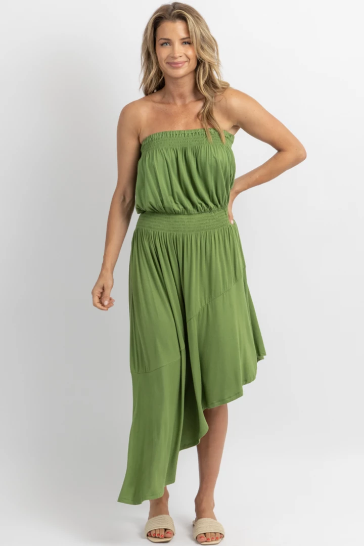 Elastic waist, Elastic band at bust, Asymmetrical hem, Super soft, Midi length