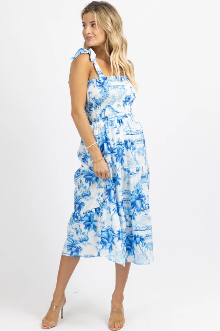 Smocked bodice, Tie straps, Midi length, Tropical palm print, Flowy bottom