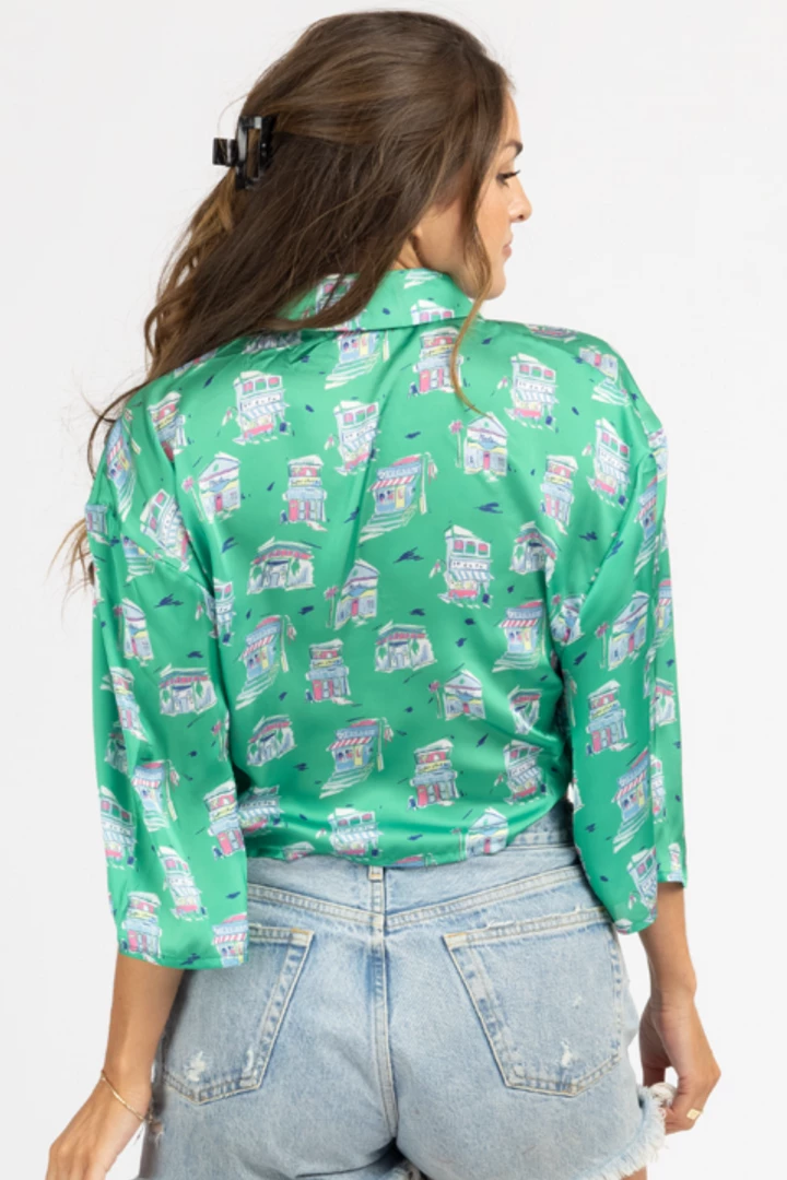 Front twist, Bell sleeves, Satinlilke, Collared, Cropped, Print