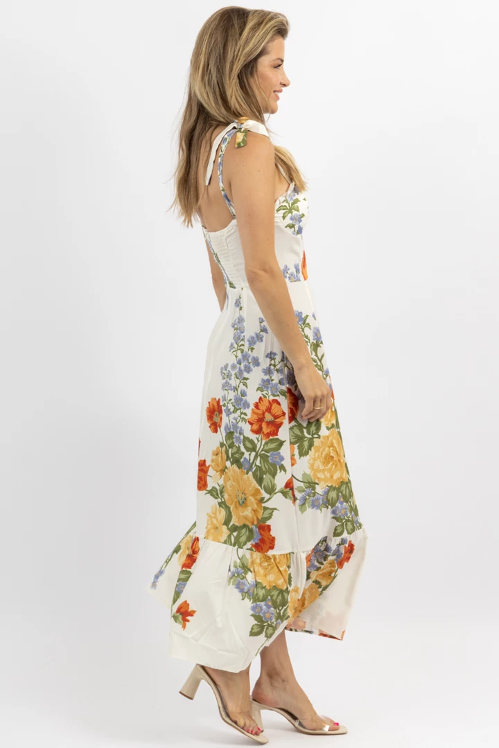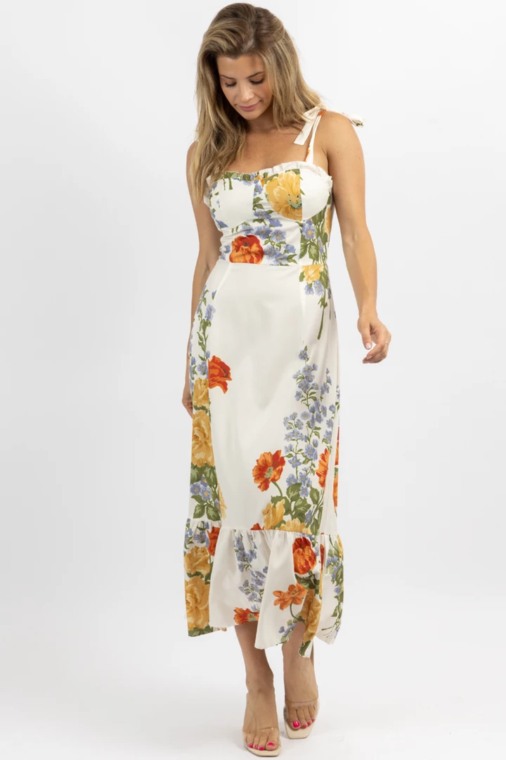 TIe straps, Ruffled bust, Floral print throughout, Back zippered, Midi length