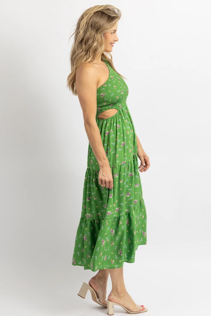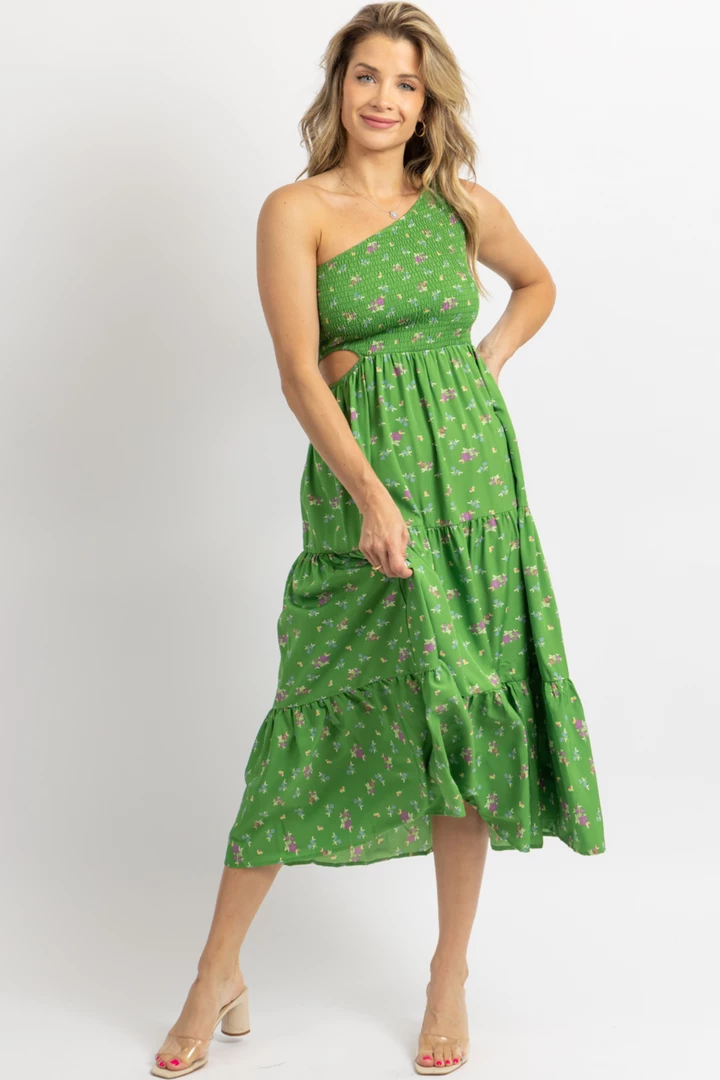 One shoulder, Smocked bodice, Midi length, Floral, Cutout midi, Sleeveless