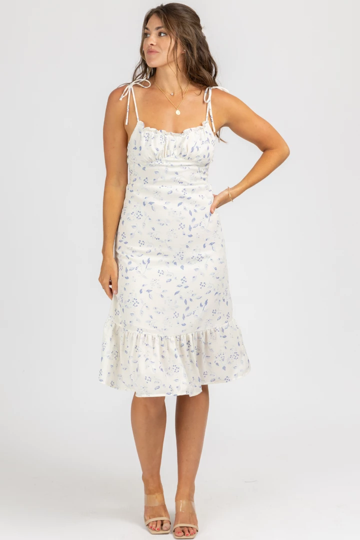 Spaghetti straps, Tie straps, Ruched bust, Midi length, Smocked back, Back zip