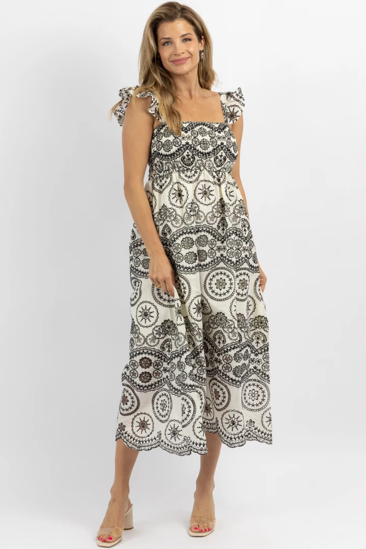 Eyelet, Embroidered, Midi length, Sleeveless with ruffled detail