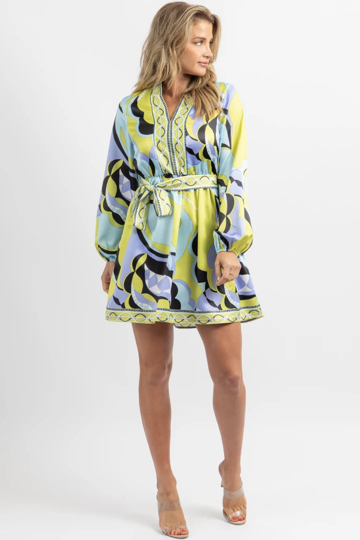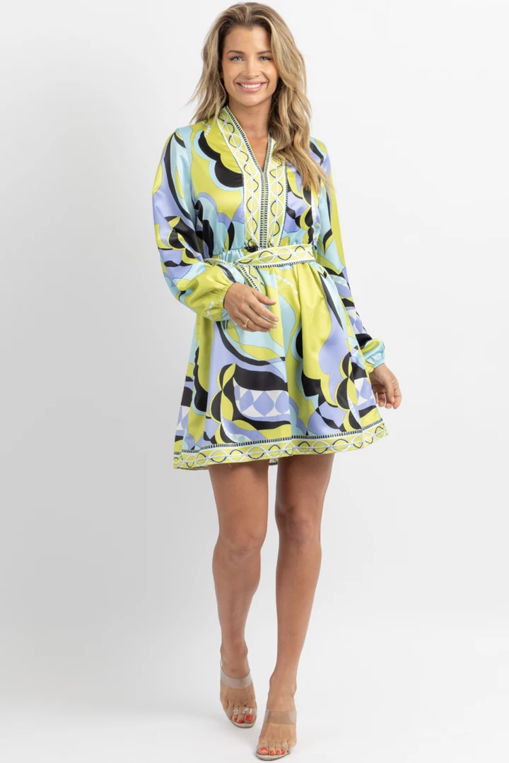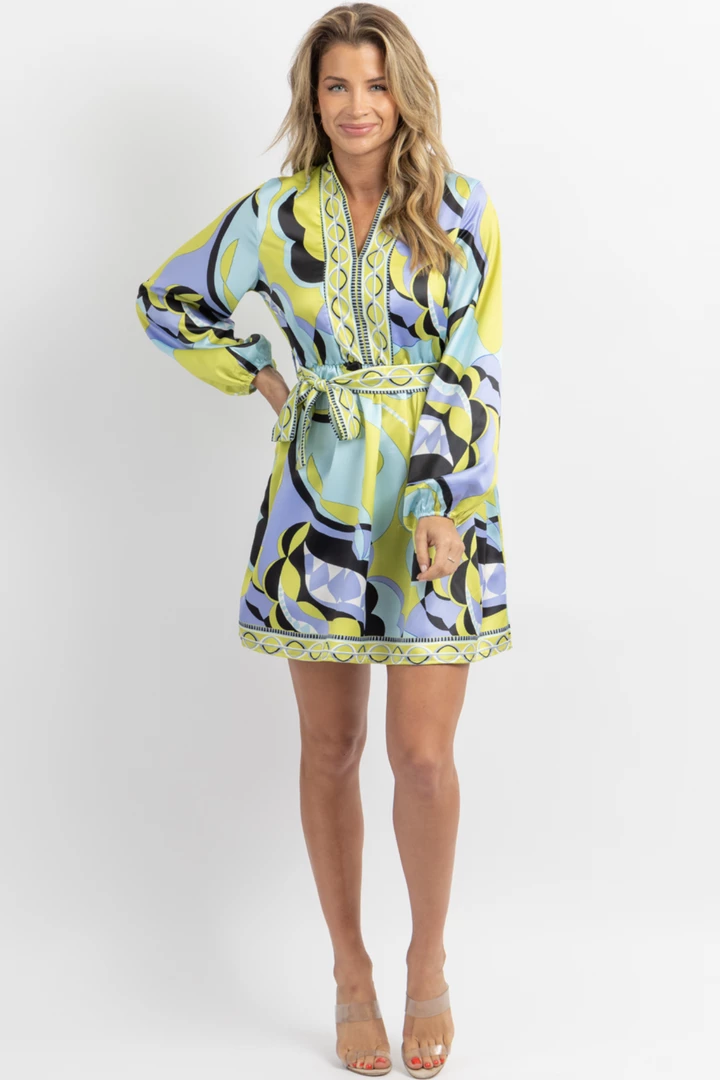 Satin, Abstract print, Long sleeves, Print, Puff sleeves, Mini dress, Waist tie