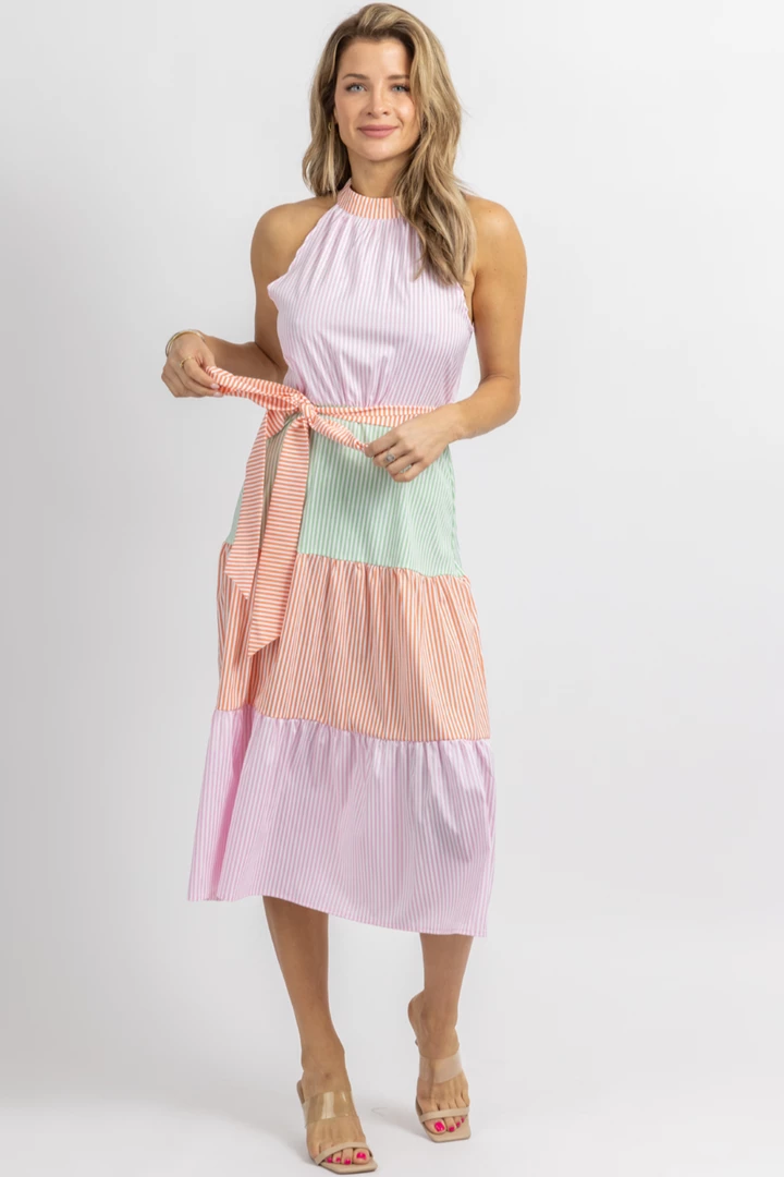 Multicolor stripes, Mock neck, Tiered ruffles, Sleeveless, Midi length