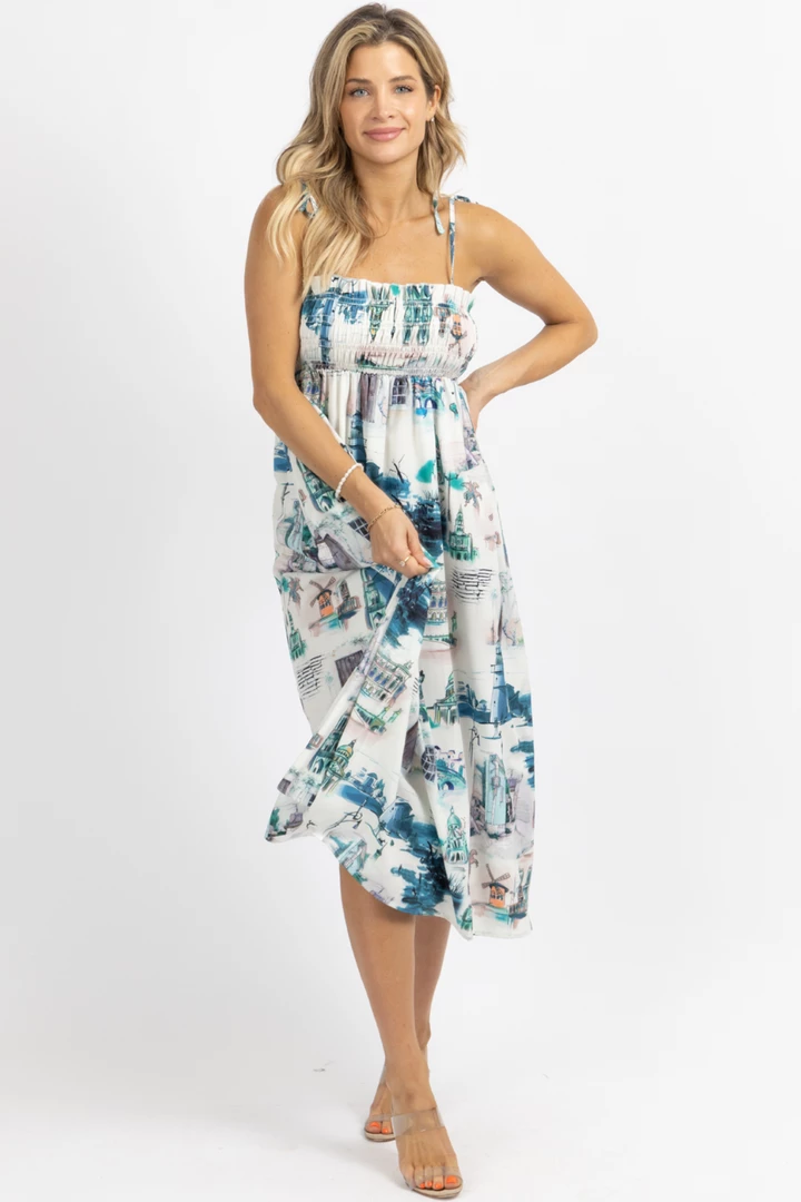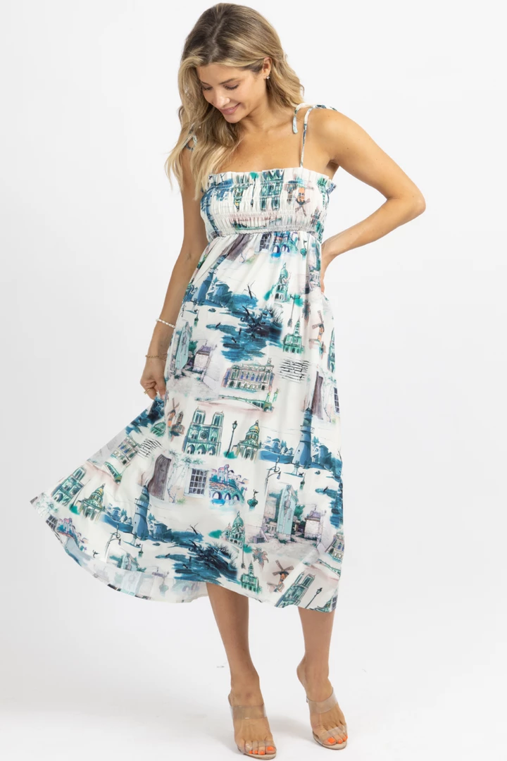 Smocked top, Tie straps, Midi length, Building print, Flowy