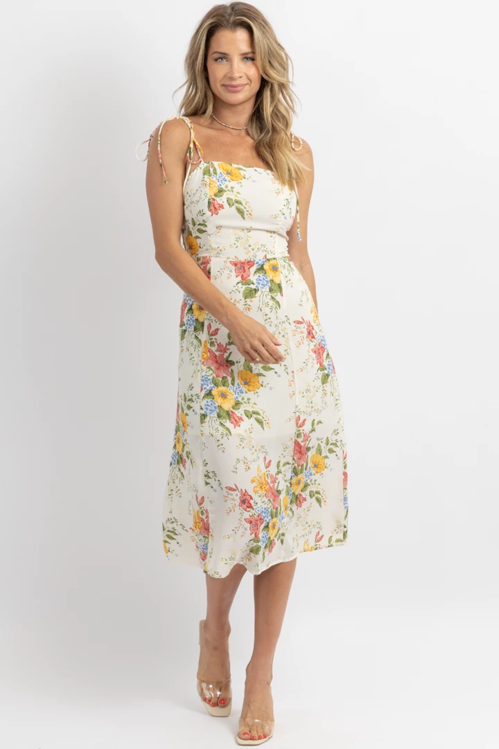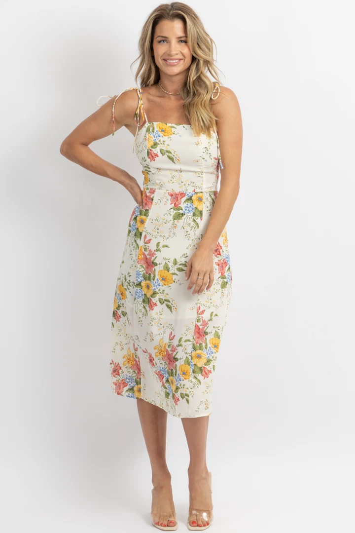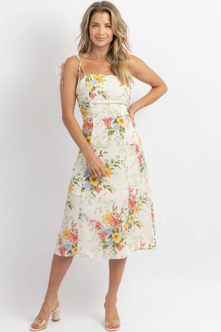Midi length, Straight neckline, Zippered, Tie straps, Floral