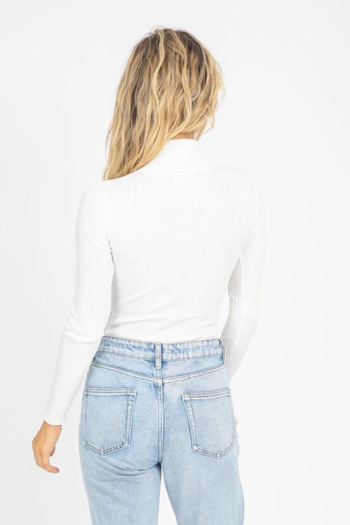 Ribbed knit turtle neck bodysuit. Snap closure and thong bottom.Â
