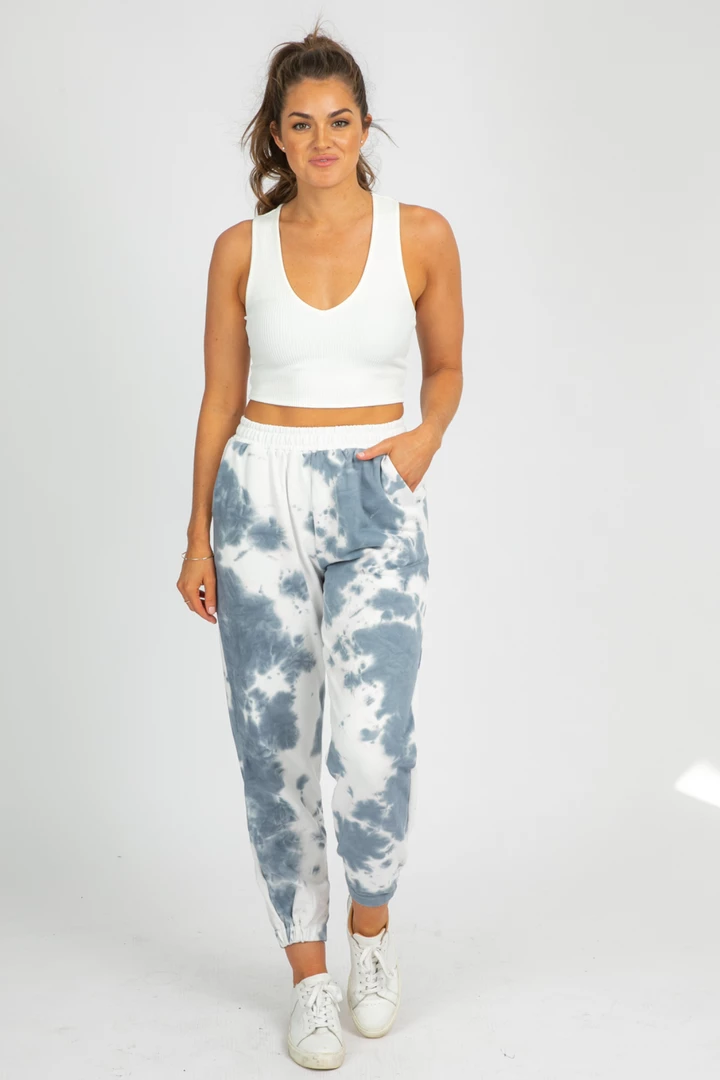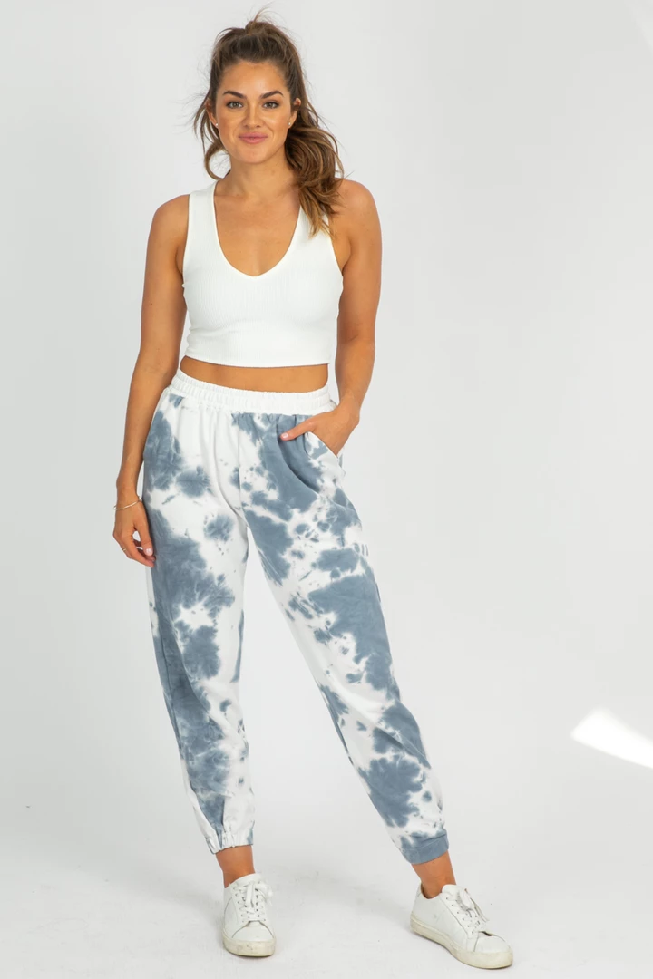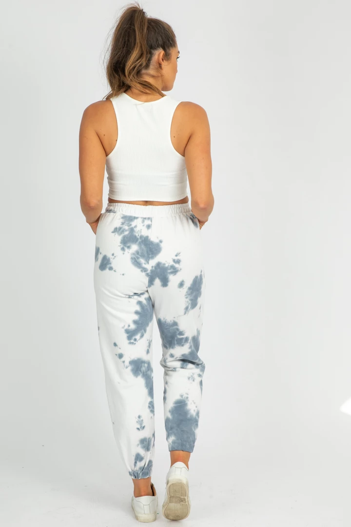 Tie-dye print french terry joggers featuring banded ankles and drawstring waist