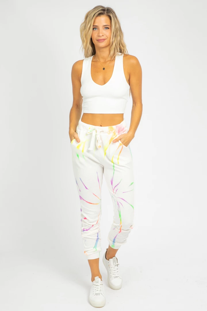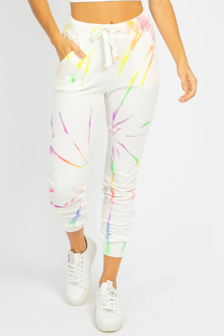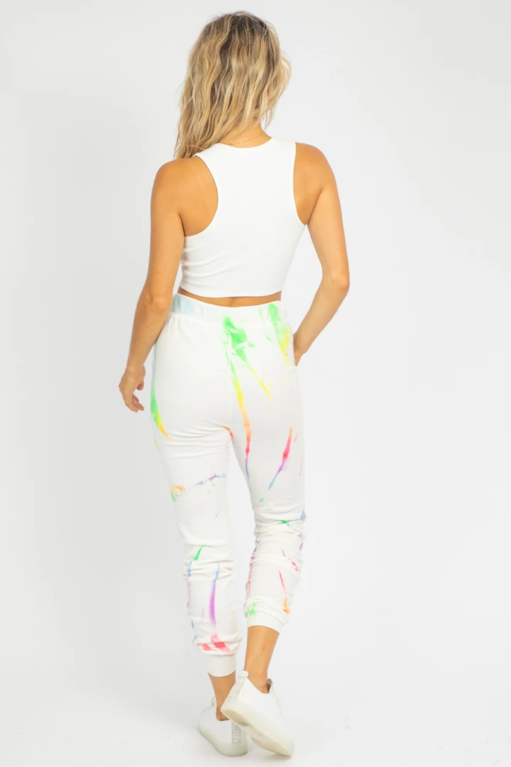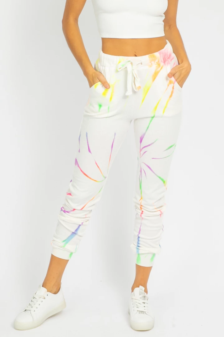 Comfy neon tie dye + ivory sweatpants. Drawstring adjustable waist, banded ankles.Â
