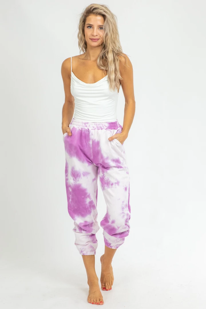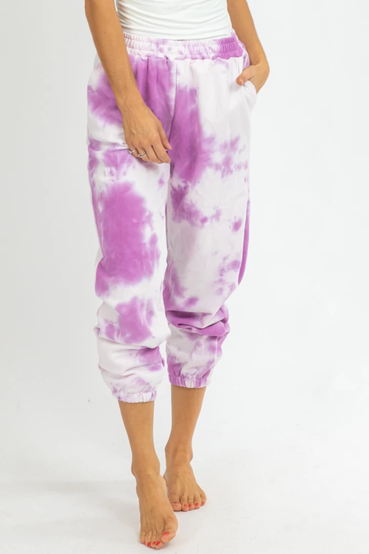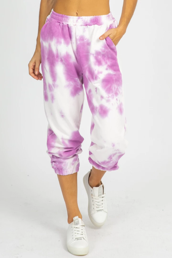 Tie-dye print french terry joggers featuring banded ankles and drawstring waist