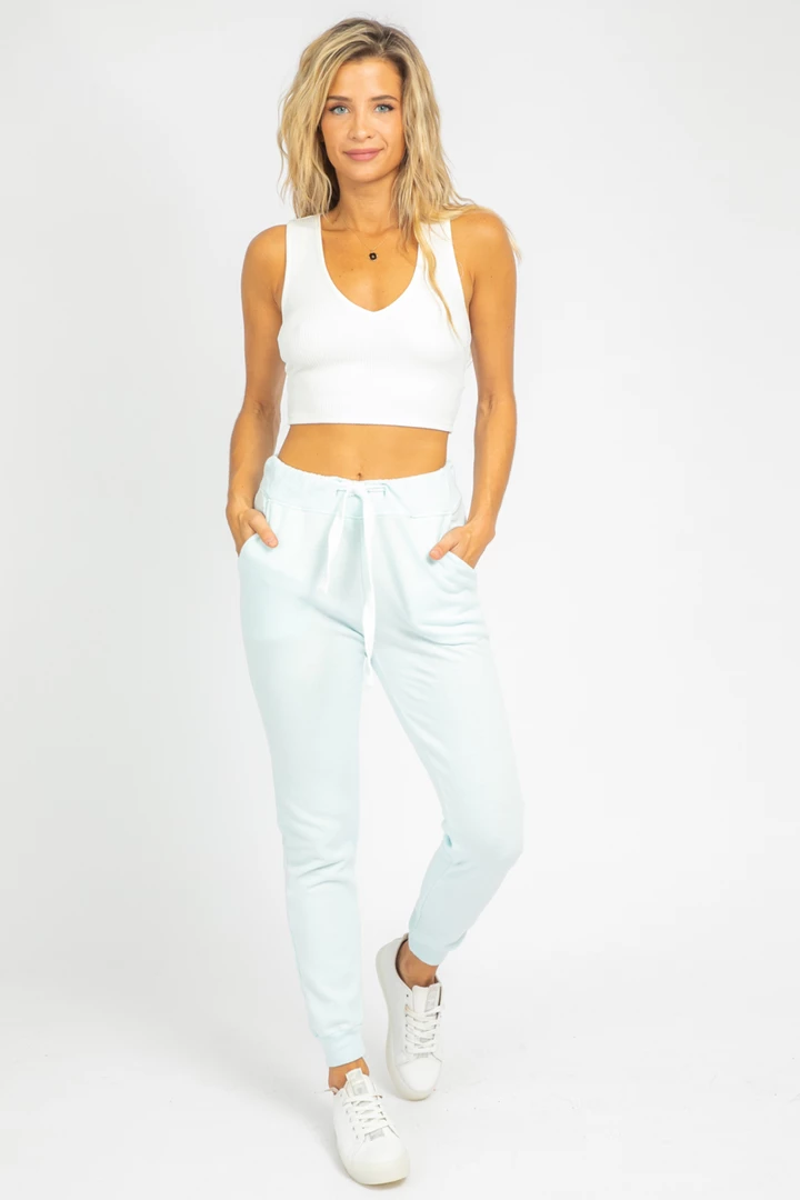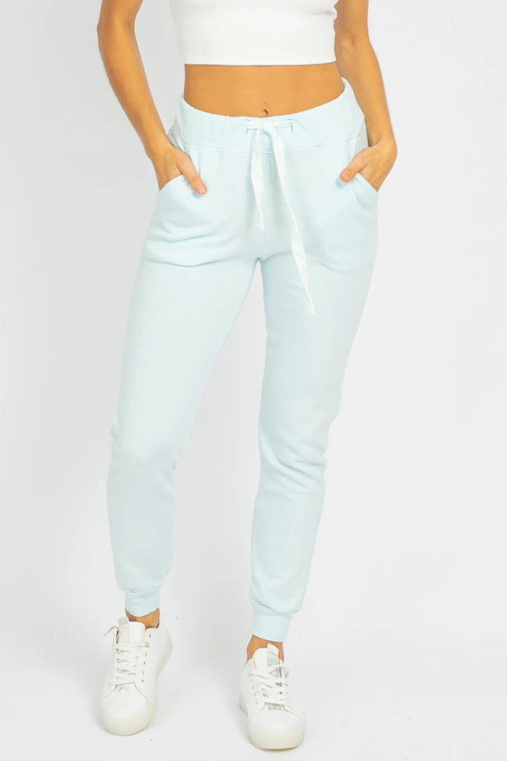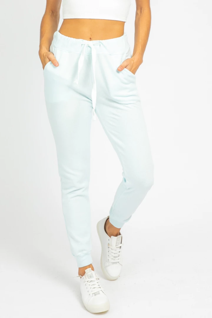 Vintage wash French terry sweatpants in sky blue. Drawstring waist. Cuffed leg.