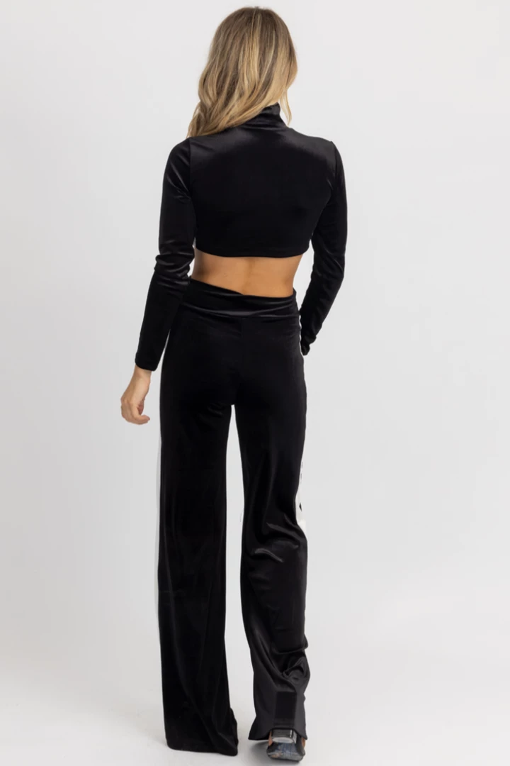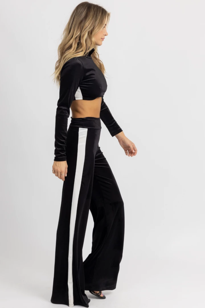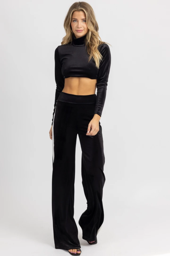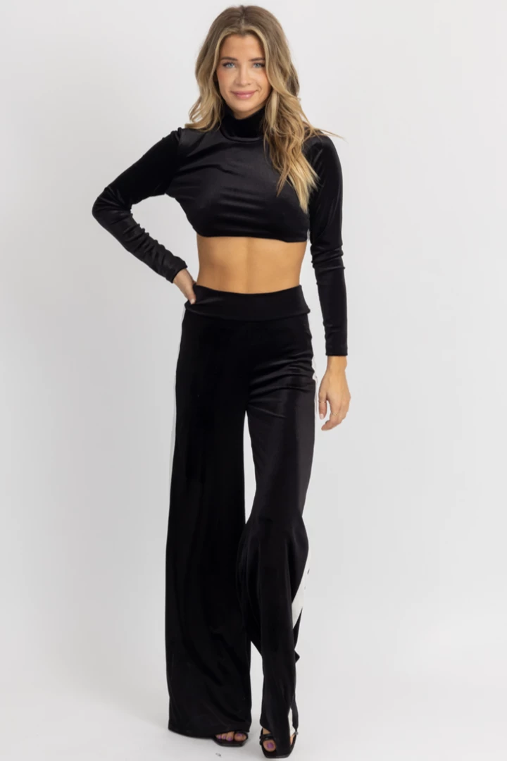 Sold together, Long sleeve cropped top, Mock neck, Side contrast stripe, High rise palazzo pants, Velvet