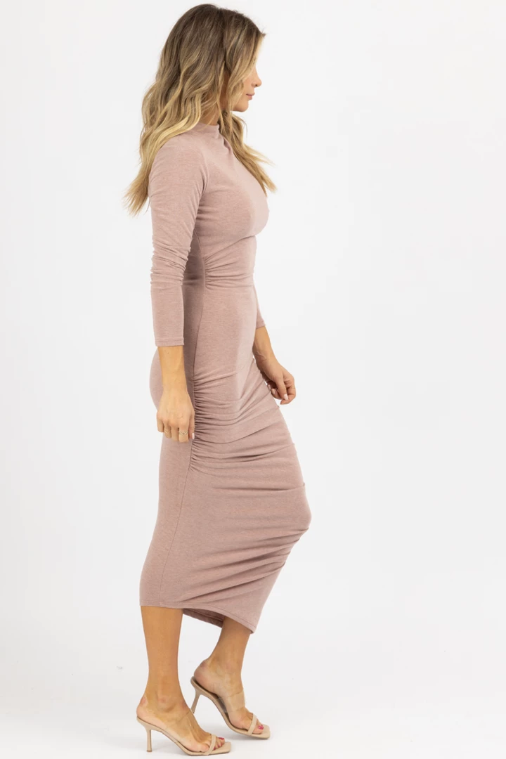 Midi length, Long sleeves, Side ruched, High neckline, Soft with stretch, Heathered, Bodycon
