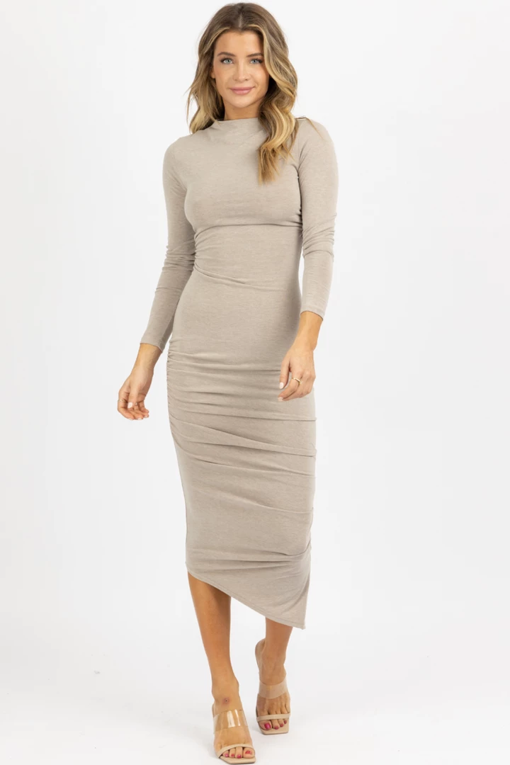 Midi length, Long sleeves, Side ruched, High neckline, Soft with stretch, Heathered, Bodycon